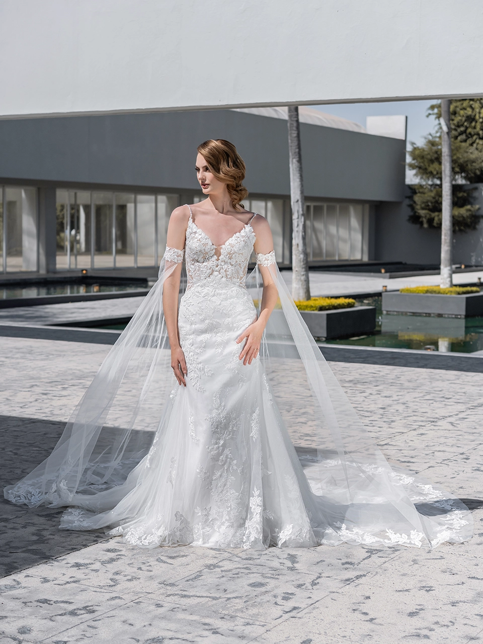 SKU EG31Vestido de novia corte sirena con capa desmontable.